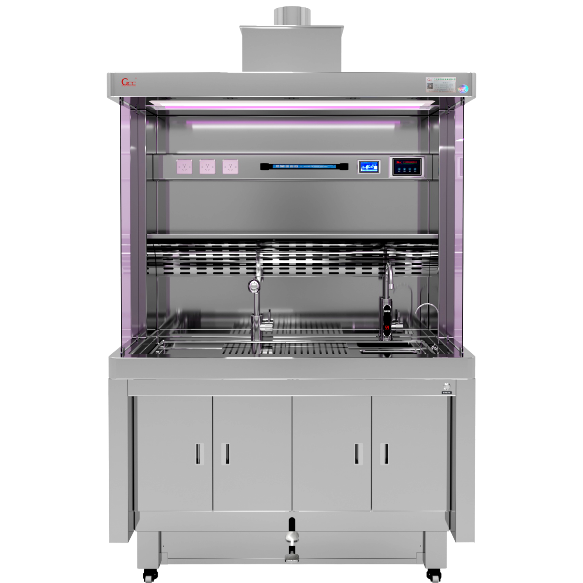 Our stainless steel Grossing Station is specifically engineered for these requirements. Constructed entirely from 304 stainless steel (1.0 mm thick), it features an upper-cabinet structure design, with the top integrating a fresh-air ventilation system and a UV sterilization lamp. Additional features include dual-side tempered glass windows, an integrated one-piece sink, a removable perforated stainless steel work surface, touchscreen control, LED lighting, down-draft ventilation, a bone tissue crusher, and multiple auxiliary accessories. This design ensures a clean, safe, and ergonomic working environment.